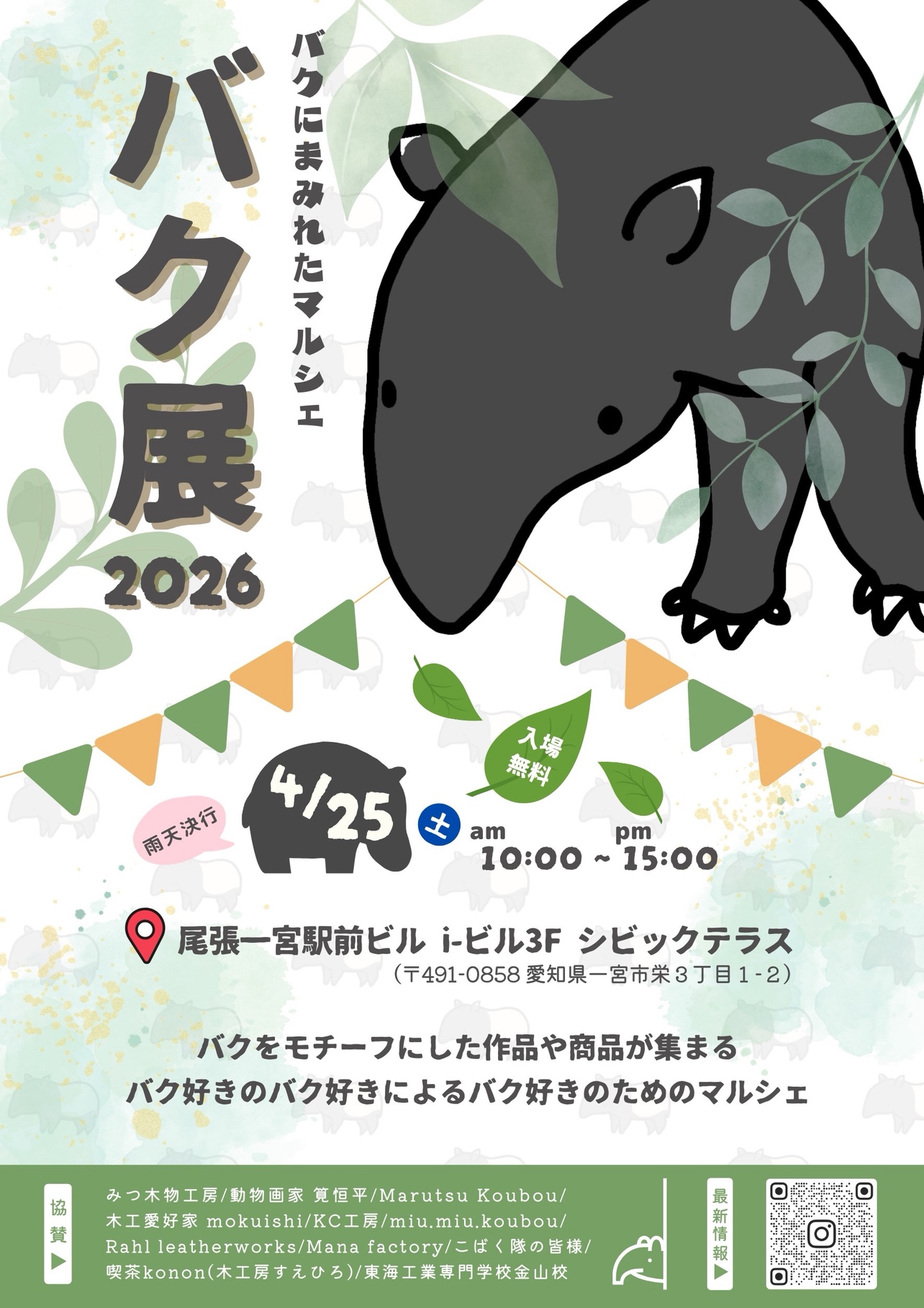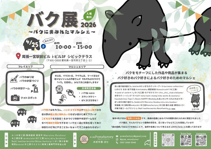 4月252026 イベント 4月25日「バク展」i-ビル3F シビックテラス バクにまみれた夢の空間をお届けします 尾張一宮駅前ビル iビル3F「シビックテラス」 この投稿をInstagramで見る 『バク展』~バクにまみれたマルシェ~(@bakuten_since2025)がシェアした投稿 この投稿をInstagramで見る 『バク展』~バクにまみれたマルシェ~(@bakuten_since2025)がシェアした投稿 この投稿をInstagramで見る 『バク展』~バクにまみれたマルシェ~(@bakuten_since2025)がシェアした投稿 バク展 イベント概要 イベント名称バク展~バク作品が集うマルシェ コンセプト愛知県でバクをモチーフとした木工作品を制作する「木好作家ぽむ」が「世界バクの日」にちなんで「バク展」を開催します! 様々なジャンルの作家さんがバクをモチーフとした作品を持ち寄るマルシェです。 来場者や子どもたちにバクや木の魅力を伝えたいという想いから企画したイベントです。 開催日2026年4月25日(土) 開催時間10:00~15:00 開催場所尾張一宮駅前ビル iビル3F シビックテラス 住所愛知県一宮市栄3丁目1−2 駐車場施設駐車場あり 最寄りの交通機関JR「尾張一宮駅」または名鉄「一宮駅」直結 ホームページ/SNSinstagram 主催木好作家 ぽむ @pom_woodlover お問い合わせInstagramDMまで 周辺MAP