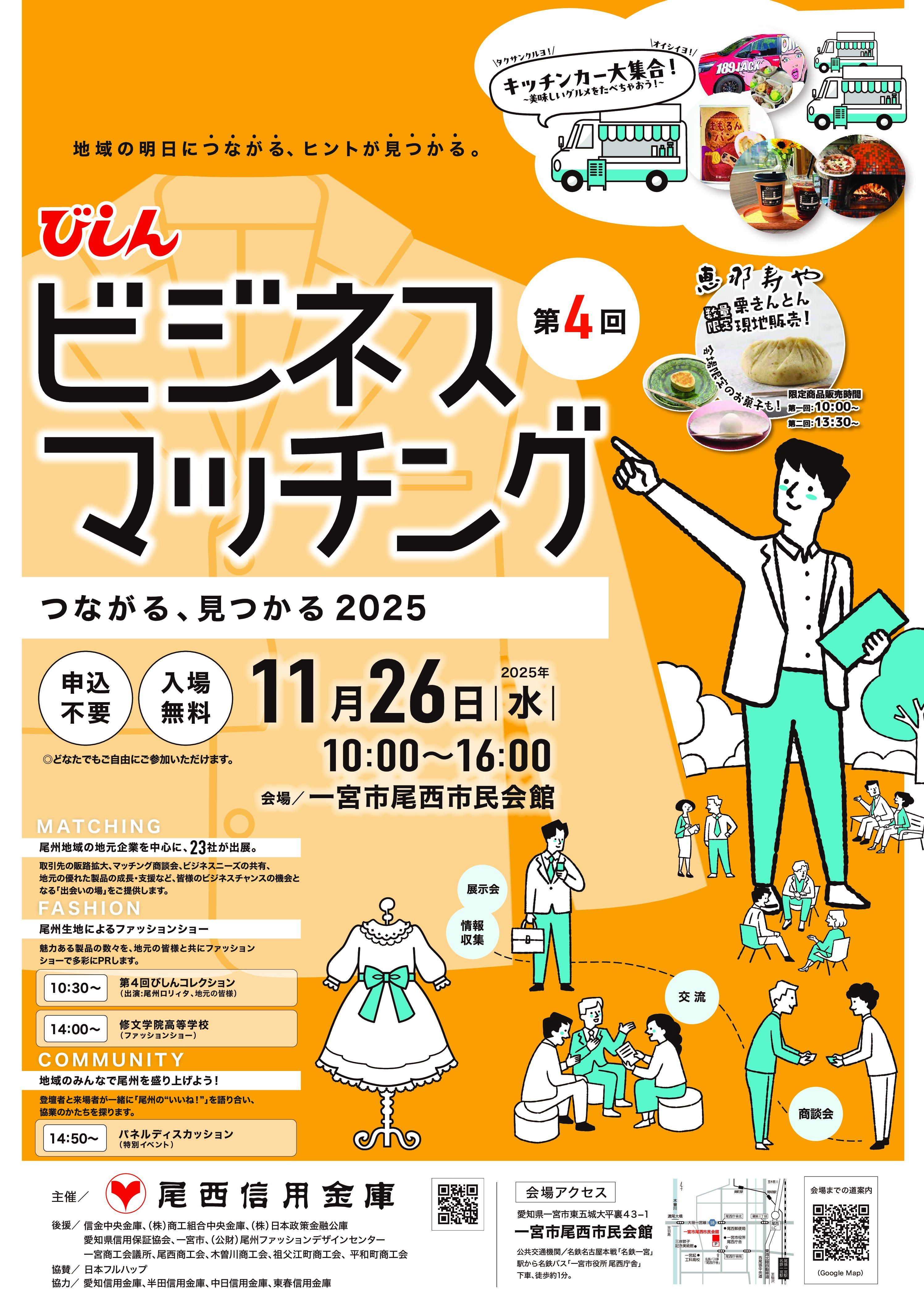 11月262025 イベント 11月26日「第4回びしんビジネスマッチング」一宮市尾西市民会館 尾州の魅力を丸ごと楽しむ! 一宮市 尾西市民会館 尾州の“今”と“未来”を感じる1日に 地場産業である尾州や繊維産業の魅力を、事業者との交流やイベントを通じて体感できる「びしんビジネスマッチング」 「地元企業の魅力を再発信し、地域を元気にしたい」という想いから、このイベントがスタートしました。ビジネスの枠を超えて、一般の来場者も楽しめる企画が盛りだくさんのイベントです。 物販ブース、ファッションショー、そして豪華賞品が当たる「尾州検定クイズラリー」さらに、地元グルメのキッチンカーも登場!!人気の「恵那寿や」さんによる栗きんとんや会場限定商品の販売もあり、五感で“尾州”を満喫できます。 今年で第4回を迎え、ますます地域と企業、そして人と人をつなぐ場として進化しています。 これからも尾州の魅力を広く発信しながら、多くの方に愛される地域イベントとして育てていきます。地元企業との交流はもちろん、ファッション・食・ものづくりを通して“尾州の今”を一緒に楽しみましょう! 「第4回びしんビジネスマッチング」 概要 イベント名称第4回びしんビジネスマッチング コンセプト地場産業である尾州や繊維産業の魅力を事業者との交流やイベントを通じて体感していただけます。取引先の販路拡大、マッチング商談会、ビジネスニーズの共有、 地元の優れた製品の成長・支援など、皆様のビジネスチャンスの機会となる「出会いの場」をご提供します。 ファッションショーやグルメなど、一般来場者の方も楽しめる企画が盛りだくさんのイベントです。 開催頻度年1回 開催 開催日2025年11月26日(水) 開催時間10:00~16:00 <プログラム> 10:30 第4回びしんコレクション(出演:尾州ロリィタ・地元の皆様) 14:00 修文学院高等学校ファッションショー 14:50 パネルディスカッション 開催場所一宮市尾西市民会館 住所愛知県 一宮市東五城大平裏43-1 駐車場あり(100台) 最寄りの交通機関JR「尾張一宮駅」または名鉄「一宮駅」より、名鉄バス20・21・26・27系統バスターミナル2番のりば「起」「蓮池」「西中野」行き「一宮市役所尾西庁舎」下車 入場無料 ホームページ/SNSwebsitecontact お問い合わせ0586-45-1310 周辺MAP