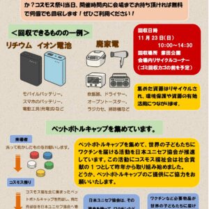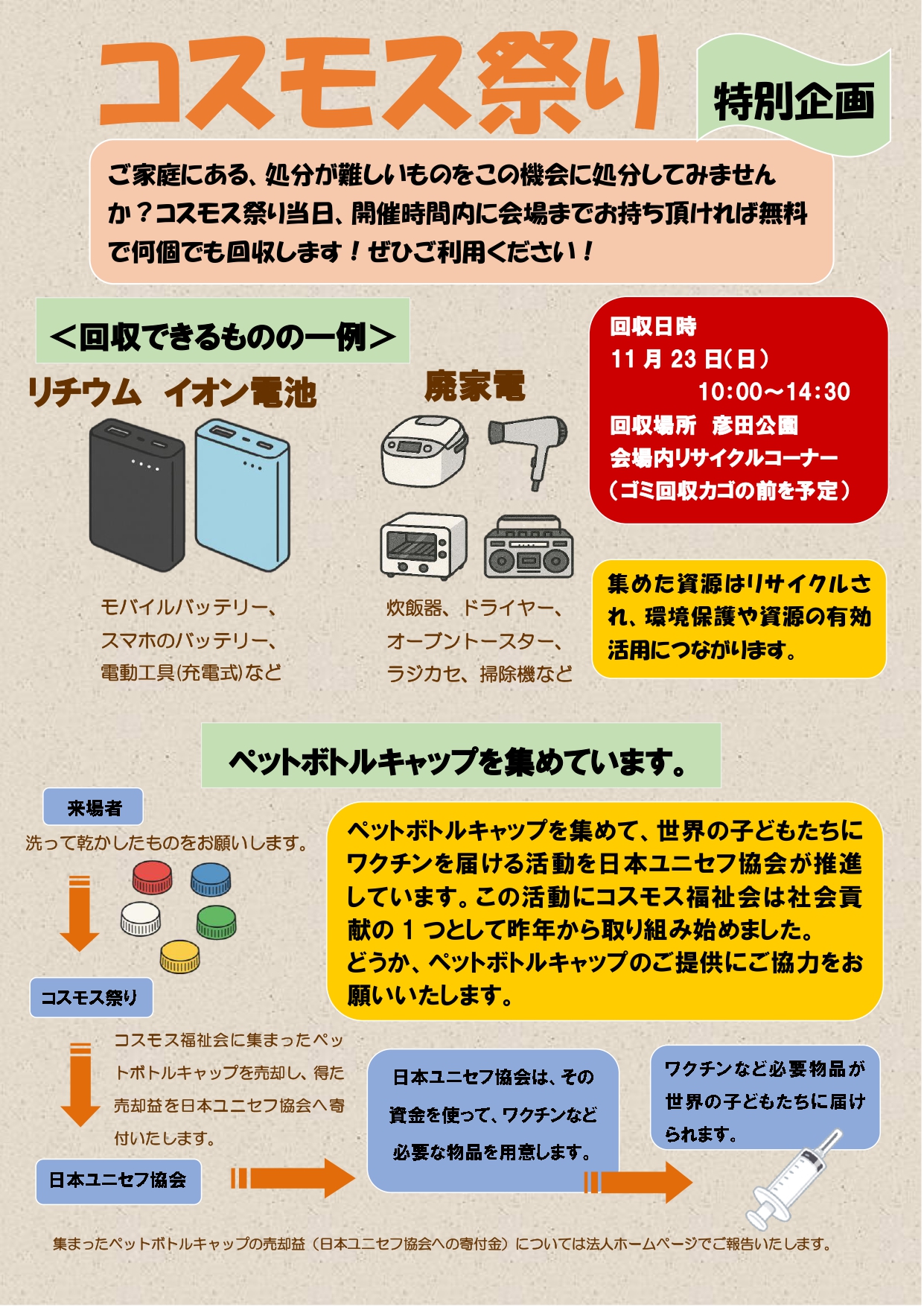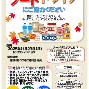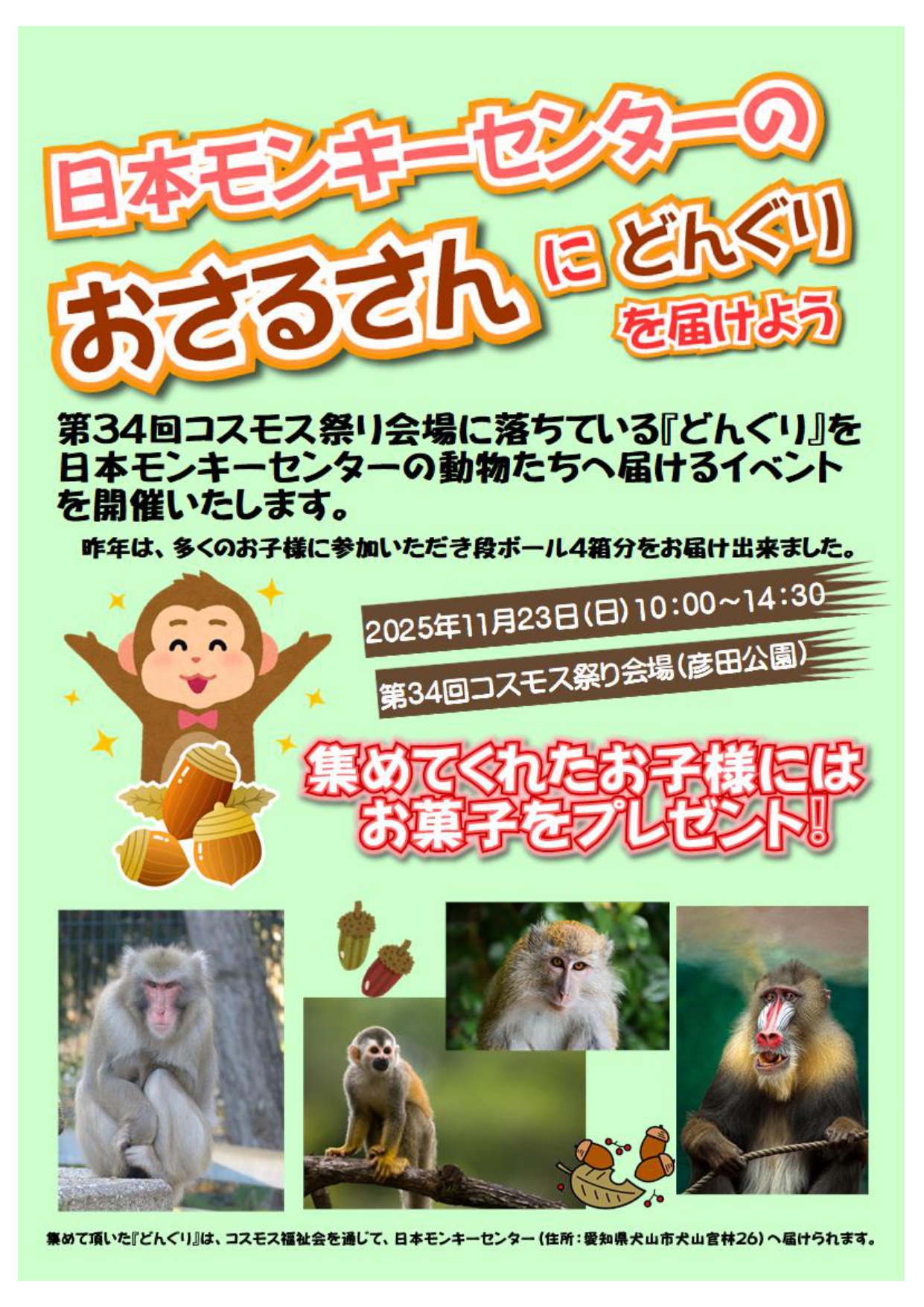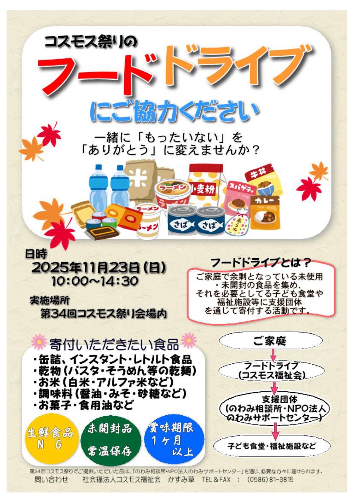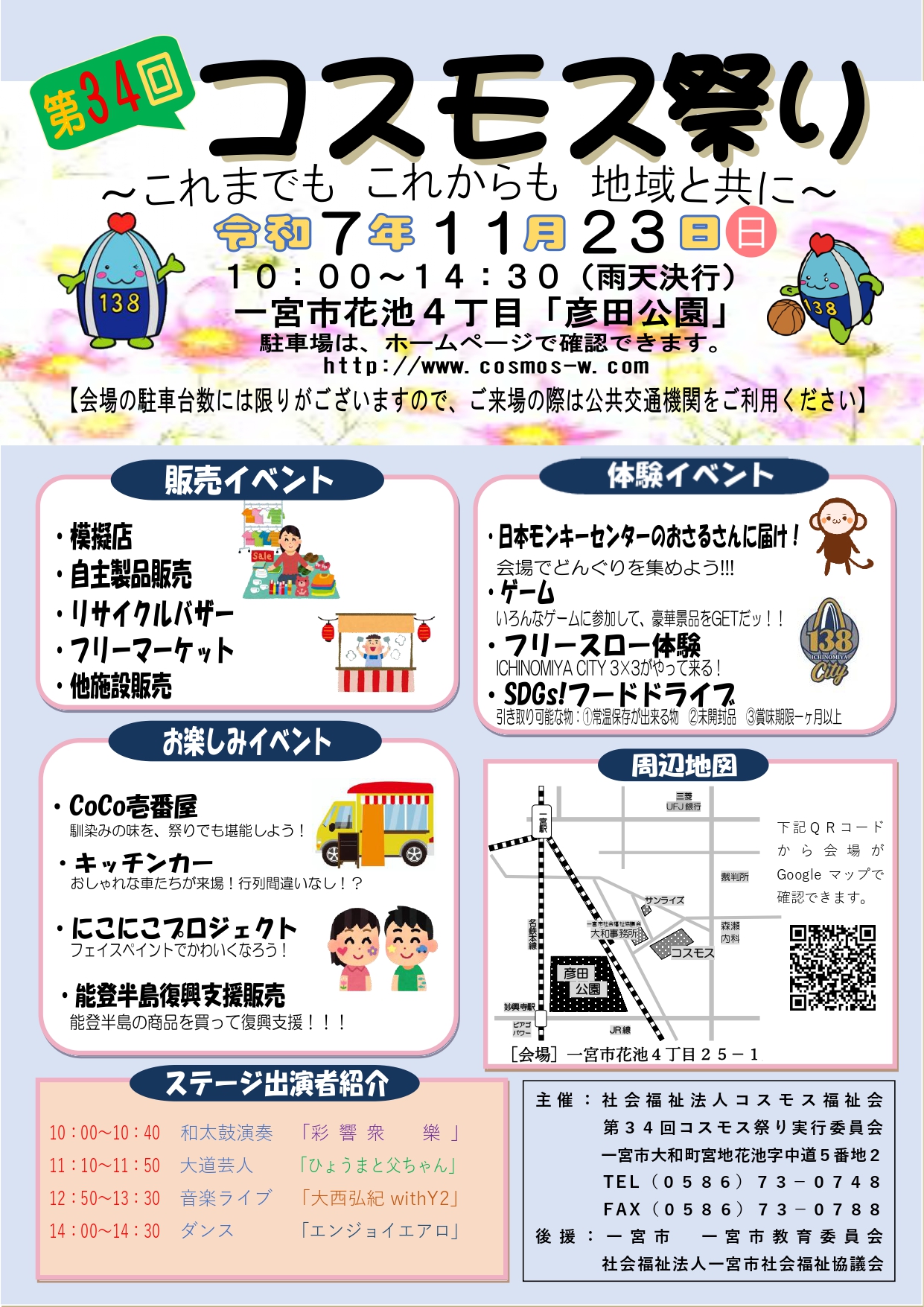 11月232025 イベント 11月23日「第34回コスモス祭り」一宮市花池 彦田公園 「これまでも これからも 地域と共に」 地域の皆さまと共に歩み、支え合いながら未来へとつなぐ——。 秋空の下、みんなの笑顔が咲く「コスモス祭り」 地域の“つながり”と“ぬくもり”があふれるおまつり「コスモス祭り」が今年も開催されます! 1990年から続くこのお祭りは「未来へ夢が持てる福祉施設づくり」と「安心して暮らせる地域づくり」をテーマに、地域の皆さんと“共に歩み・共に楽しむ”イベントです♪ 家族みんなで楽しめる企画が盛りだくさん! ▽事業所製品販売コーナー心をこめて作られた手づくり品がずらり!ここでしか手に入らない温かみのあるアイテムが見つかるかも? ▽模擬店&飲食ブースおいしいグルメでおなかもニコニコ♪ 地元の味やスイーツを楽しもう! ▽ステージイベントダンス・演奏・パフォーマンスなど、見て・聴いて・一緒に盛り上がろう! ▽ゲームコーナー・体験ブース 子どもたちに大人気!楽しく遊びながら挑戦しよう! 未来へつなぐ“笑顔”の輪を、あなたと一緒に 毎年たくさんの笑顔があふれるコスモス祭り。ちいさな子どもからご年配の方まで、誰もが楽しめる1日です。 今年も、地域みんなで手を携えながら“これまでも これからも”つづく温かい時間を一緒に過ごしましょう。 秋の一日、家族や仲間と一緒に「コスモス祭り」へ! 笑顔と出会いが咲く公園で、皆様をお待ちしています♪ 第34回コスモス祭り 概要 イベント名称第34回コスモス祭り 概要~これまでも これからも 地域と共に~ 地域のつながりと笑顔をテーマに、今年も「コスモス祭り」を開催!事業所製品の販売や模擬店、ステージ企画、ゲーム・体験ブースなど、家族みんなで楽しめる企画が盛りだくさんです。未来へ夢が持てる福祉施設づくりと、安心して暮らせる地域づくりを目指して―― 笑顔あふれる秋の一日を、ぜひ彦田公園でお過ごしください。 開催頻度年1回 開催日2025年11月23日(日) ※雨天決行 開催時間10:00~14:30 開催場所彦田公園 住所愛知県一宮市花池四丁目25-1 駐車場あり(台数に限りあり) ※詳細・駐車場案内はコスモス福祉会ホームページをご覧ください。 ※できる限り公共交通機関でのご利用をお願いいたします。 最寄りの交通機関名鉄「妙興寺駅」徒歩5分 ホームページ/SNSwebsite お問い合わせTEL0586-25-1158 主催社会福祉法人コスモス福祉会 第34回コスモス祭り実行委員会 後援一宮市・一宮市教育委員会・社会福祉法人一宮市社会福祉協議会 周辺MAP
