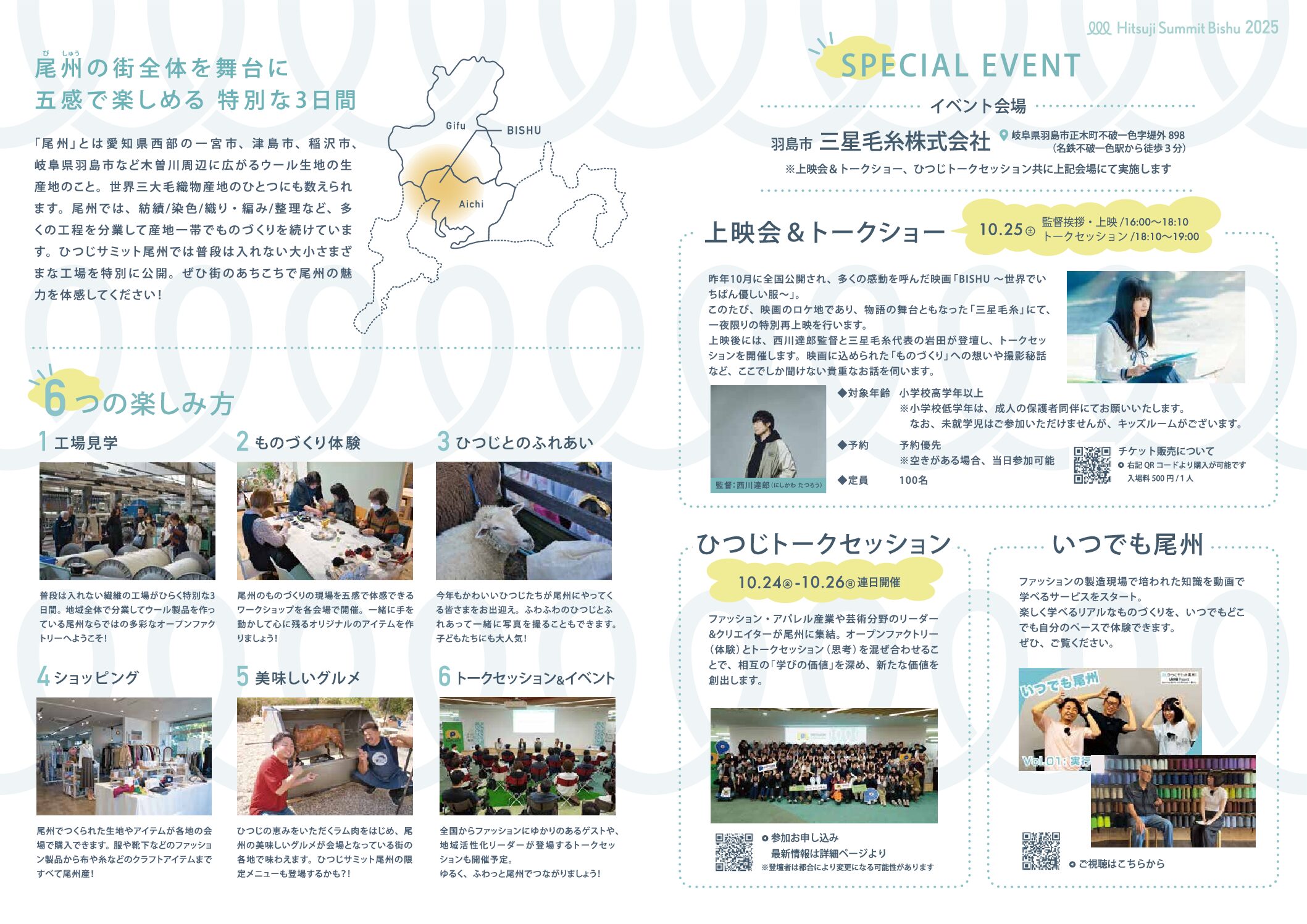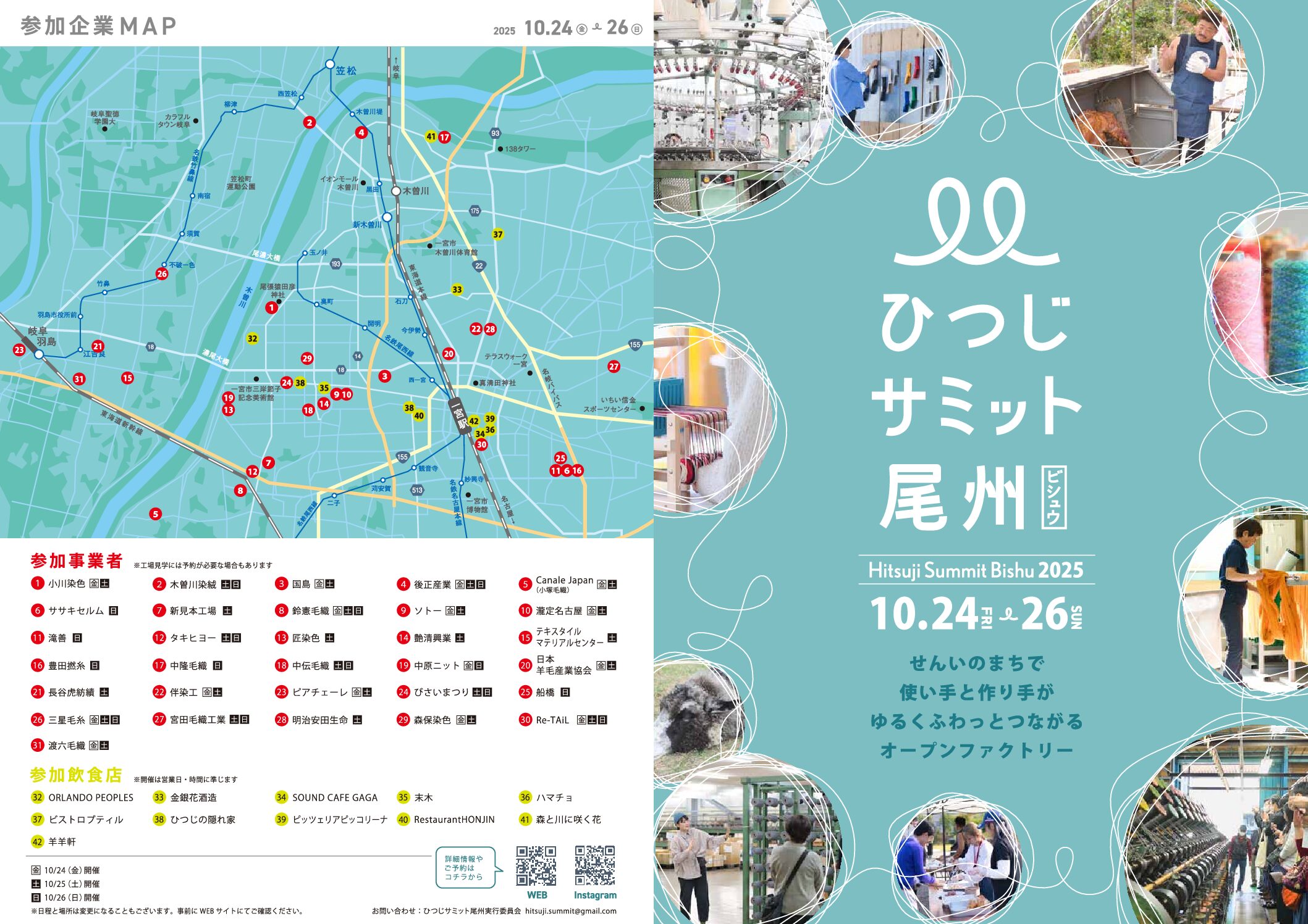 10月242025 イベント 10月24-26日「ひつじサミット尾州」一宮市 使い手と作り手がゆるく、ふわっとつながるオープンファクトリー ~工場がひらく、まちがひらく。ひつじとつながる3日間~ ひつじサミット尾州とは? 世界三大毛織物産地のひとつ「尾州(びしゅう)」を舞台にした、ものづくりやひつじの魅力にふれられる産業観光イベントです。 ふわっとやさしい羊たちとの出会い、普段は入れない工場の見学、おいしいグルメやお買いものまで、まち全体が“ひつじ色”に染まる特別な3日間。 家族で、友達と、もちろんおひとりでも。五感で楽しめる尾州の旅へようこそ! 6つの楽しみ方 1. 工場見学尾州ならでは!分業で生地をつくる多彩な工場を大公開。普段は見られない織りや染めの現場をのぞいてみよう。 2. ものづくり体験世界にひとつだけのクラフトやアイテムを作れるワークショップ。子どもから大人まで楽しめます。 3. ひつじとのふれあいふわふわのひつじたちが会場に登場!写真を撮ったり、なでたり。お子さまに大人気です。 4. ショッピング尾州生まれの生地やファッション雑貨、靴下、糸などがずらり。ここだけのアイテムも見つかるかも。 5. 美味しいグルメラム肉料理や尾州のご当地グルメも楽しめます。イベント限定メニューも登場予定! 6. トークセッション&イベントファッションや地域づくりのゲストによるお話や、街角でのイベントが目白押し♪ 「ひつじサミット尾州」 概要 イベント名称ひつじサミット尾州 コンセプトひつじサミット尾州とは? 世界三大毛織物産地のひとつ「尾州(びしゅう)」を舞台にした、ものづくりやひつじの魅力にふれられる産業観光イベントです。 ふわっとやさしい羊たちとの出会い、普段は入れない工場の見学、おいしいグルメやお買いものまで、まち全体が“ひつじ色”に染まる特別な3日間。 家族で、友達と、もちろんおひとりでも。五感で楽しめる尾州の旅へようこそ! 開催頻度年1回 開催 開催日2025年10月24日(金)・25日(土)・26日(日) 開催時間イベント会場により異なります 開催場所愛知県一宮市・津島市・岐阜県羽島市など、尾州エリア一帯 ホームページ/SNSwebsitefacebookinstagramcontact お問い合わせひつじサミット尾州実行委員会 hitsuji.summit@gmail.com この投稿をInstagramで見る ひつじサミット尾州【25年10/24〜26開催】(@hitsujisummitbishu)がシェアした投稿 この投稿をInstagramで見る ひつじサミット尾州【25年10/24〜26開催】(@hitsujisummitbishu)がシェアした投稿 この投稿をInstagramで見る ひつじサミット尾州【25年10/24〜26開催】(@hitsujisummitbishu)がシェアした投稿