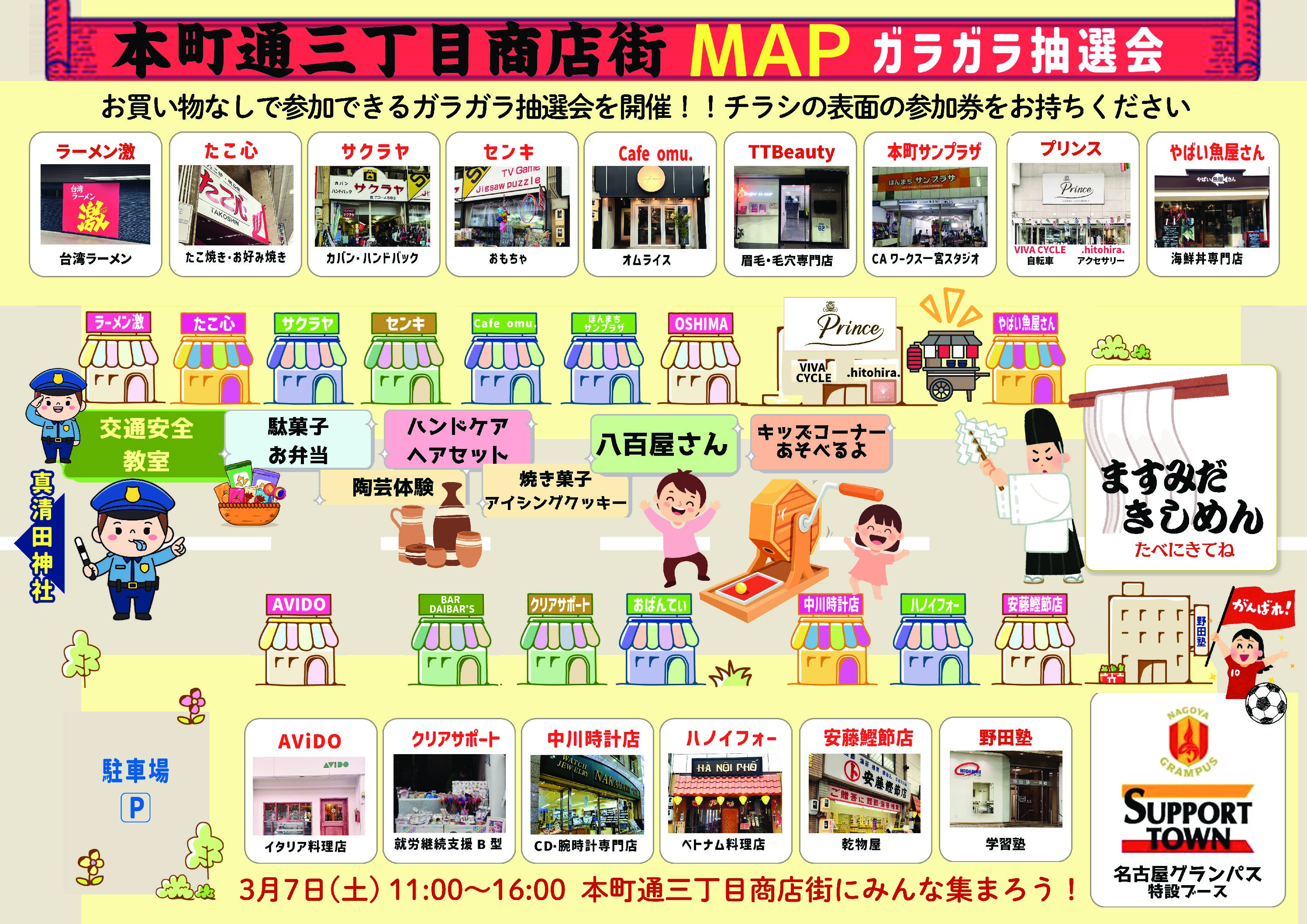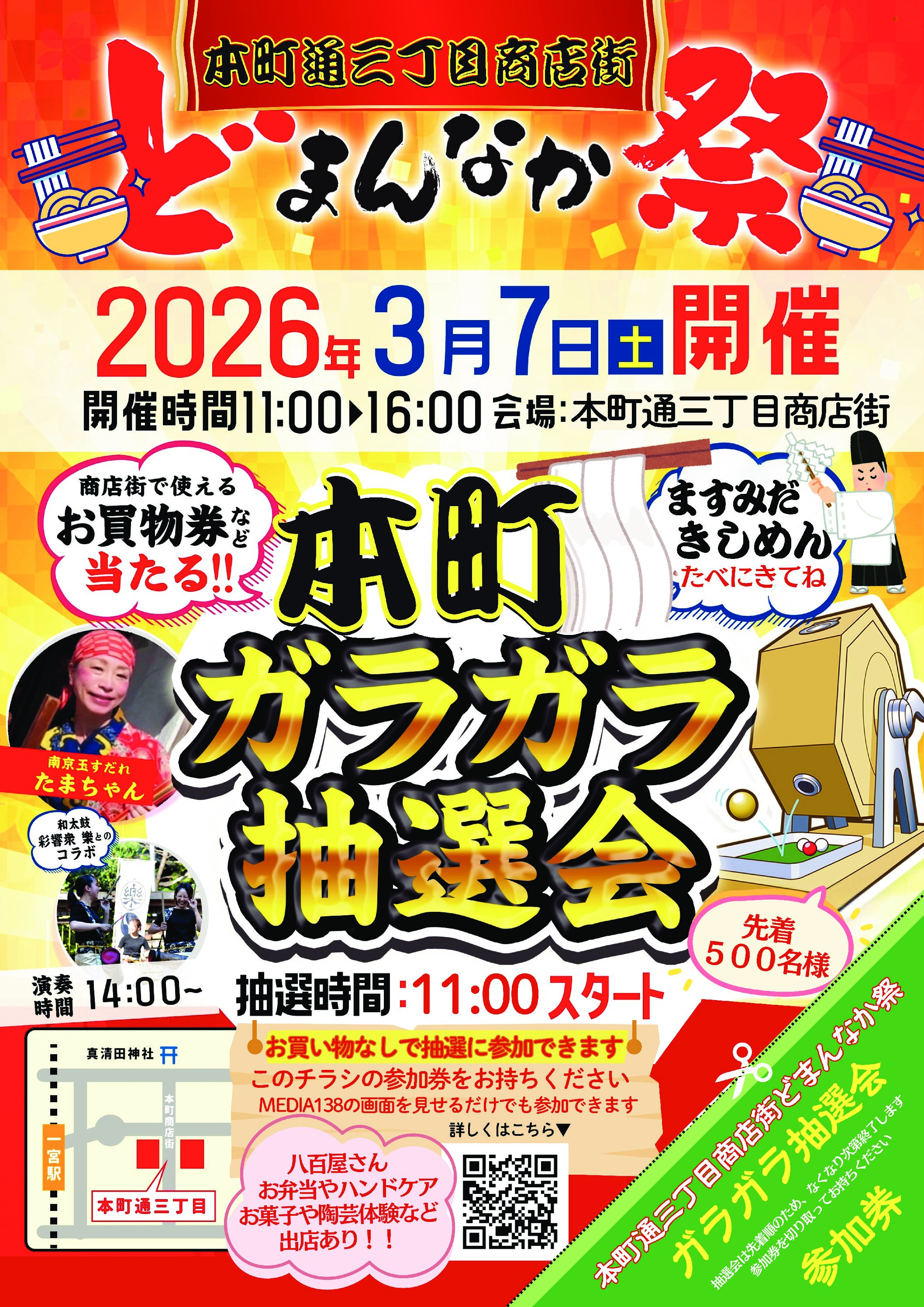 3月072026 マルシェ 3月7日「本町三丁目どまんなか祭~大抽選会」一宮市本町通三丁目商店街 年に一度!!商店街の「おすすめ&お得があたる」大抽選会 一宮市本町通三丁目商店街 お買い物なしで、この画面の提示で抽選に参加できます 本町商店街が、笑顔とおいしさでいっぱいになる一日! 本町どまんなか祭りは、子どもから大人まで楽しめる、わくわく盛りだくさんのお祭りです。 11:00スタート!どなたでも参加OKのガラガラ大抽選会!! なんと、どまんなか祭のガラガラ抽選会は、お買い物なしで参加できます! 商店街で配布しているチラシに付いている抽選会参加券をお持ちください。 さらに! MEDIA138のホームページ画面を見せるだけでも抽選に参加できますよ♪ 気軽にチャレンジして、うれしい景品をゲットしよう! 今回初登場・初命名!「ますみだきしめん」 どまんなか祭りでしか味わえない特別企画! 真清田神社でご祈祷いただいた「ますみだきしめん」が、初登場します。 ここでしか食べられない、今回が初命名・初お披露目の特別な一杯。 特設ブースにて、うちたての「ますみだきしめん」を、ぜひご堪能ください。 おいしい!たのしい!出店も充実 お祭りならではのラインナップが勢ぞろい! ・新鮮野菜が並ぶ八百屋さん ・やみつきになる絶品お弁当 ・焼き菓子やアイシングクッキー ・癒しのハンドケア・ヘアセット ・わくわく陶芸体験 ・名古屋グランパスの応援ブースも!! 普段は商店街にないお店も特別出店! 大人も子どもも楽しめる体験型ブースが盛りだくさんです♪ 歩くだけでも楽しい、本町商店街ならではのラインナップです。 14:00〜 南京玉すだれショー開催! 笑いと驚きがいっぱいの南京玉すだれショーをお届け! 子どもたちに大人気のパフォーマー「たまちゃん」が登場します (@otamasan.mc) ご家族そろって、ぜひ本町どまんなか祭りへ! 一日たっぷり、楽しい時間をお過ごしください♪ 南京玉すだれのパフォーマンスも 本町三丁目どまんなか祭 概要 イベント名称本町三丁目どまんなか祭 コンセプト新春イベント「本町三丁目どまんなか祭」開催! 豪華賞品が当たる大抽選会や、新登場の「真清田きしめん」 パフォーマー「たまちゃん」の南京玉すだれショーも楽しめます! お弁当やお菓子、バルーンブースなど特別出店も充実! 家族みんなで本町三丁目商店街にぜひお越しください 開催頻度年1回 開催 開催日2026年3月7日(土) 開催時間11:00~16:00 ガラガラ抽選会は 11:00スタート 開催場所本町通三丁目商店街エリア 住所愛知県一宮市本町三丁目 駐車場近隣コインパーキングをご利用ください 最寄りの交通機関JR「尾張一宮駅」名鉄「一宮駅」より徒歩6分 ホームページ/SNS お問い合わせTEL0586-73-8566 周辺MAP