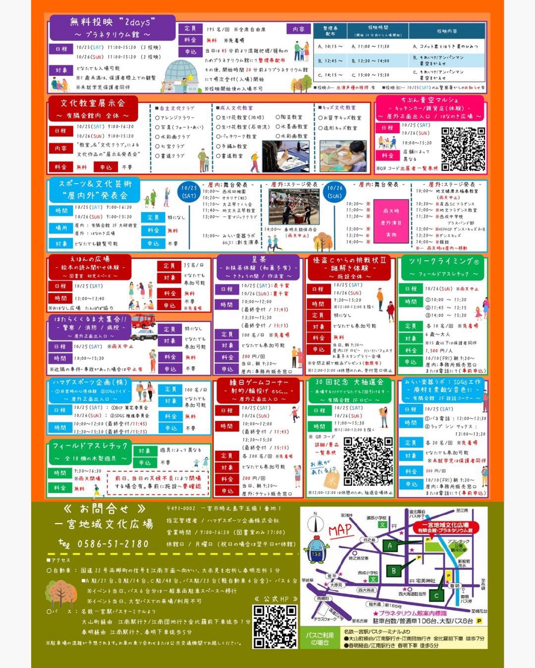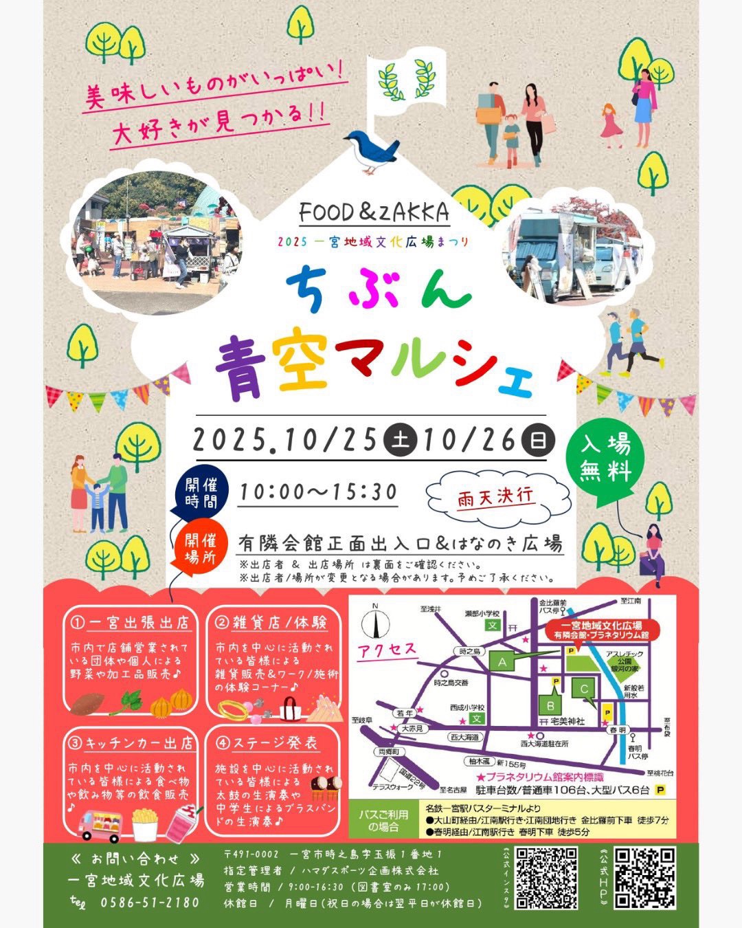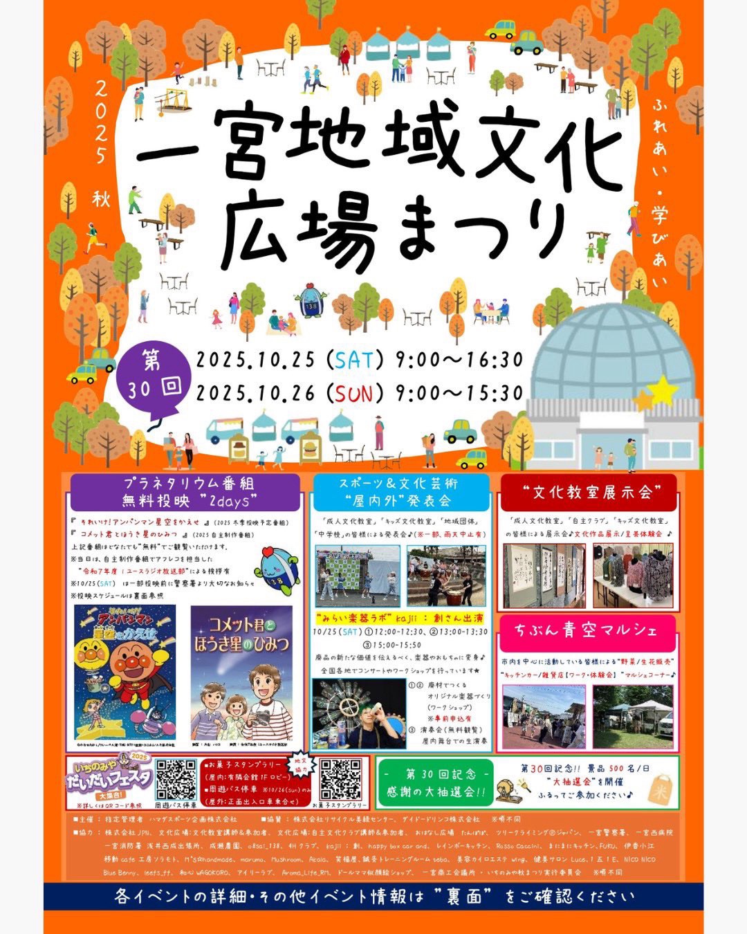 10月252025 イベント 10月25-26日「一宮地域文化広場まつり 青空マルシェ」 第30回 一宮地域文化まつり 開催! 今年も“地文まつり”で、まるごと1日楽しもう! プラネタリウム無料投映やステージ発表、青空マルシェ、縁日、体験ブースなど盛りだくさん!さらに30回目を記念して、みらい楽器ラボ Kajii:創さんのステージや大抽選会も開催!!家族みんなで、学んで、遊んで、感じて、笑顔になれる秋の文化フェスティバルです♪ エリア紹介① プラネタリウムゾーン 「地文といえばプラネタリウム!」地文まつりの人気コンテンツ・プラネタリウムが、なんと無料投映!! 大人気の「アンパンマン」シリーズや、iユースラジオ放送部によるアフレコ自主制作番組『コメット君とほうき星のひみつ』を上映! 番組内容は時間ごとに変わります。整理券配布時間をチェックして、宇宙の旅に出かけよう! エリア紹介② ステージ発表ゾーン 「がんばった姿、ここに!」 はなのき広場と大研修室の2会場で、地域の団体や地文・尾文教室の皆さんが出演。和太鼓・ダンス・合唱・器楽など、日頃の練習の成果を披露します。 心を込めたステージで、みんなの笑顔とエネルギーを感じてください♪※雨天時は中止となる場合があります。 エリア紹介③ 屋外体験&縁日ゾーン 「体験して、遊んで、食べて大満足!」 外の広場では、働く車ブース・縁日コーナー・ワークショップブースなど、家族で楽しめる体験がいっぱい!1日限定のブースもあるので、スケジュールをチェックして遊びに来てくださいね♪ エリア紹介④ 室内体験&展示ゾーン 「室内でもたっぷり楽しめる!」 屋外だけじゃない!地文まつりは館内も見どころ満載!! ・呈茶体験でほっと一息・絵本の読み聞かせで心温まる時間・子どもたちに人気の謎解きイベント・おかしの無料配布 さらに、地文の教室で制作された作品展示もあり、アートに触れられるひとときも♪ 今年は大抽選会とみらい楽器ラボ Kajii:創さんのワークショップも開催!にぎやかな屋外のあとは、室内でゆったりお楽しみください。 エリア紹介⑤ 青空マルシェゾーン 「青空の下で、おいしい・かわいい・たのしいが大集合!」 昨年大好評だった青空マルシェが今年も登場! 地元農家さんの新鮮野菜やキッチンカーのグルメ、ハンドメイド雑貨やワークショップなど、大人も子どもも楽しめるブースが勢ぞろい! ▼農産物・フードブース成瀬農園(とうもろこし・ローゼル)/4Hクラブ(季節の野菜)/RossoCaccini(焼きたてピザ)/まにまにキッチン(ローストビーフ丼)など多数出店! ▼ハンドメイド&体験ブースM’s⭐︎handmade(ストーンアクセサリー)/和心WAGOKORO(ボールペン作り)/Akala(グラスサンド)/ドールママの似顔絵ショップ/NICONICO(キーホルダー制作)などなど! ▼リラクゼーション・体験ブース美容カイロエステwing、健美サロンLuce、鍼灸トレーニングルームtebaなどによる施術・診断体験 地元の「おいしい」「たのしい」「やさしい」が詰まったマルシェです♪ スペシャル企画 ▼第30回記念!大抽選会当日来場者にうれしいチャンス!豪華景品が当たる大抽選会を開催!※抽選方法・時間などは当日会場でご案内します。 ▼みらい楽器ラボ Kajii:創さんステージ&ワークショップ音と遊びの天才・Kajii:創さんによるステージは必見!子どもも大人も夢中になるサウンド体験で、まつりをさらに盛り上げます。 青空マルシェ イベント 概要 イベント名称一宮地域文化広場まつり・青空マルシェ 概要一宮地域文化広場は今年で45周年!!マルシェ、縁日、プラネタリウム無料投映等々1日遊べる内容が盛りだくさん!ぜひ遊びに来てくださいね♪ 開催頻度年2回 開催日2025年10月25日(土)・26日(日) 開催時間10月25日(土) 9:00~16:30 10月26日(日) 9:00~15:30 開催場所一宮地域文化広場(青空マルシェ:有隣会館・はなのき広場) 住所愛知県一宮市時之島字玉振1番地1 駐車場あり ※詳細はページ下部参照 最寄りの交通機関<名鉄バス> 大山町経由 江南駅行き・江南団地行き「金比羅前」下車 徒歩7分 春明経由 江南駅行き「春明」下車 徒歩5分 ホームページ/SNSwebsiteinstagramcontact お問い合わせTEL 0586-51-2180 または お問い合わせフォームよりご連絡ください 備考・イベント中に撮影した写真を当施設の掲示板やブログに使用する事があります。支障のある方は事前にお申し出ください この投稿をInstagramで見る 一宮地域文化広場(@ichinomiya_chiikibunka)がシェアした投稿 この投稿をInstagramで見る 一宮地域文化広場(@ichinomiya_chiikibunka)がシェアした投稿 この投稿をInstagramで見る 一宮地域文化広場(@ichinomiya_chiikibunka)がシェアした投稿 周辺MAP 駐車場案内 一宮地域文化広場 A駐車場:21台収容(Google map) 一宮地域文化広場 C駐車場:48台・23台収容(Google map) 一宮地域文化広場 宿泊者専用駐車場:14台収容(Google map)