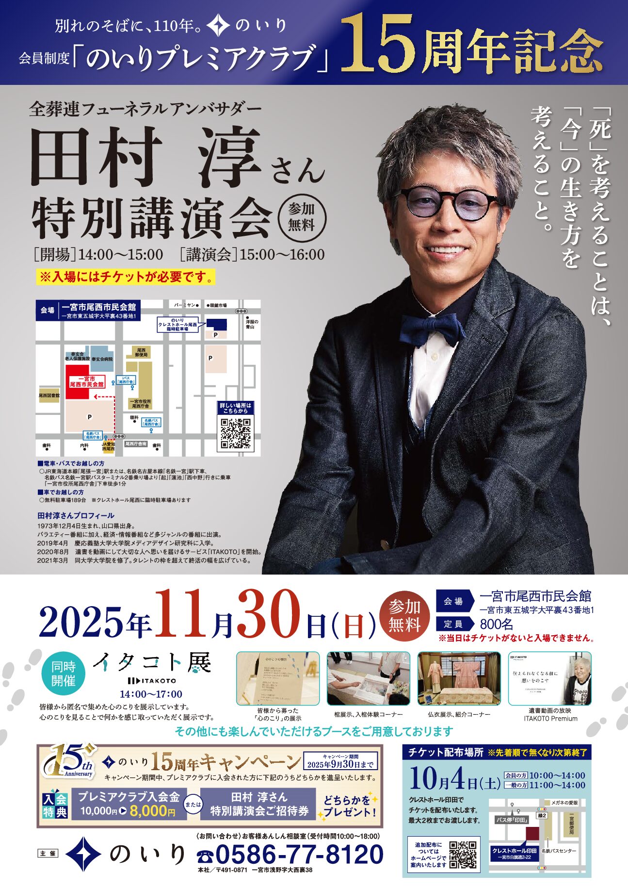 10月042025 セミナー 入場チケット(無料)配布「田村淳氏 特別講演会・イタコト展」一宮市尾西市民会館 葬儀社のいり会員制度「のいりプレミアクラブ」15周年記念イベント 特別講演 「死」を考えることは、「今」の生き方を考えること チケット(無料)配布場所・時間 日時:2025年10月4日(土) 場所:のいり クレストホール印田 ■配布時間 会員の方: 10:00~14:00 一般の方: 11:00~14:00 のいりプレミアクラブ会員ではない方も参加できます。 会員の方には1時間先行で配布を開始いたします。 ※先着順で無くなり次第終了 ※おひとり様につき、最大2枚までお渡しします 田村淳氏 特別講演会・イタコト展 概要 イベント名称田村淳氏 特別講演会・イタコト展 コンセプト株式会社のいり会員制度「のいりプレミアクラブ」15周年記念として、田村淳さんをお招きして特別講演会と、多彩なブースを楽しめるイベントを開催します。講演会では、「死」を考えることは、「今」の生き方を考えること、をテーマにお話しいただきます。また「イタコト展」を同時開催、皆様から匿名で集めた「心のこり」を展示しています。「心のこり」を見ることで何かを感じ取っていただく展示です。 そのほか、遺影動画の放映、棺展示、入棺体験コーナー、仏衣展示、紹介コーナーなど、その他にも楽しんでいただけるブースをご用意しております。 入場には事前配布のチケットが必要ですので、詳細は公式サイトをご確認ください。 開催日2025年11月30日(日) 開催時間15:00~16:00 (開場14:00) 開催場所一宮市尾西市民会館 住所愛知県 一宮市東五城大平裏43-1 駐車場無料駐車場189台完備 ※のいり クレストホール尾西に臨時駐車場もございます 最寄りの交通機関JR「尾張一宮駅」または名鉄「一宮駅」より、名鉄バス20・21・26・27系統バスターミナル2番のりば「起」「蓮池」「西中野」行き「一宮市役所尾西庁舎」下車 チケット【参加無料】 配布日時:2025年10月4日(土) 配布場所:のいり クレストホール印田 配布時間: ・会員の方 10:00~14:00 ・一般の方 11:00~14:00 ※のいりプレミアクラブ会員ではない方も参加できます。会員の方には1時間先行で配布を開始いたします。 ※先着順で無くなり次第終了、お1人様につき、最大2枚までお渡しします。 ホームページ/SNSwebsite お問い合わせ株式会社のいり(TEL:0586-77-1255) 周辺MAP