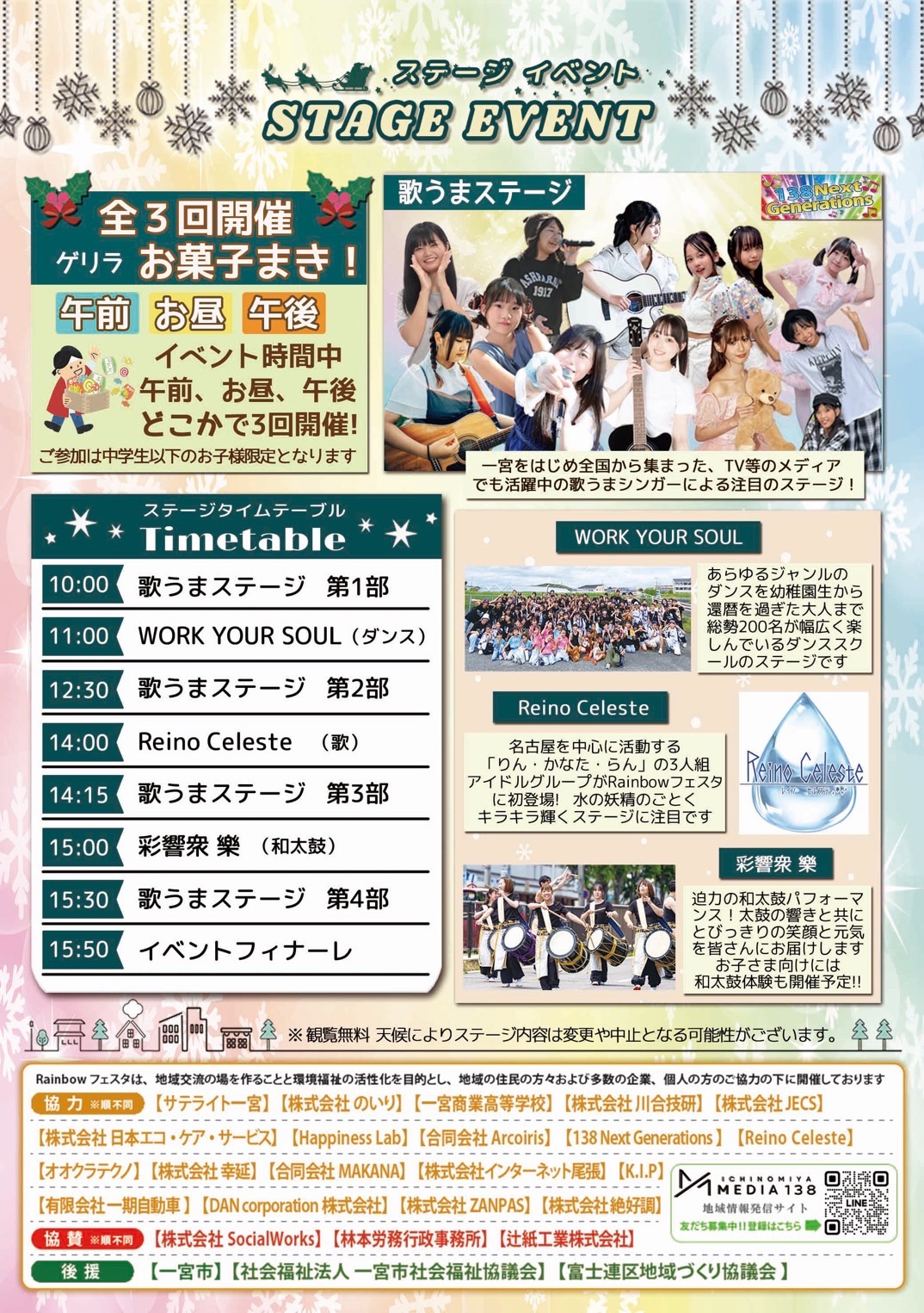 12月132025 マルシェ 12月13日「Rainbow Festa レインボーフェスタ」サテライト一宮 第13回のテーマは「ほっこり冬のキッズフェスタ」 サテライト一宮 「秋の響き 収穫の輪」をテーマに多数のフェスタを彩る人気ブースが集合 地域の皆さんにお祭り気分で楽しんでいただけるイベントを開催して、人と人をつなぐ地域交流の場を作りたい。 そんな願いから始まった、Rainbowフェスタ。 お弁当と軽食 Rainbowが主催で、普段は、障がいを持っているスタッフと一緒にお弁当屋さんを営んでいます。 スタッフも一緒に楽しみながら、福祉に対して理解してもらえる環境づくりを進めています。 Rainbow フェスタ 概要 イベント名称第13回 Rainbow フェスタ コンセプト地域にお住まいの方々皆さんに楽しんでいただけるイベントを開催し、人と人をつなぐ地域交流の場を作ると同時に、広く福祉への理解を得る機会を設け、地域環境福祉 活性化の一助となる事を目的としています。 開催頻度隔月 開催 開催日2025年12月13日(土) 開催時間10:00~16:00 開催場所サテライト一宮 住所愛知県一宮市羽衣2丁目5−100 駐車場あり 最寄りの交通機関尾張一宮駅東口(JR側)駅交番前一般車両乗降場からサテライト一宮までシャトルバス運行中 ワークショップあり ホームページ/SNSinstagramcontact お問い合わせTEL050-3706-0279 初回開催時期2022年11月 周辺MAP