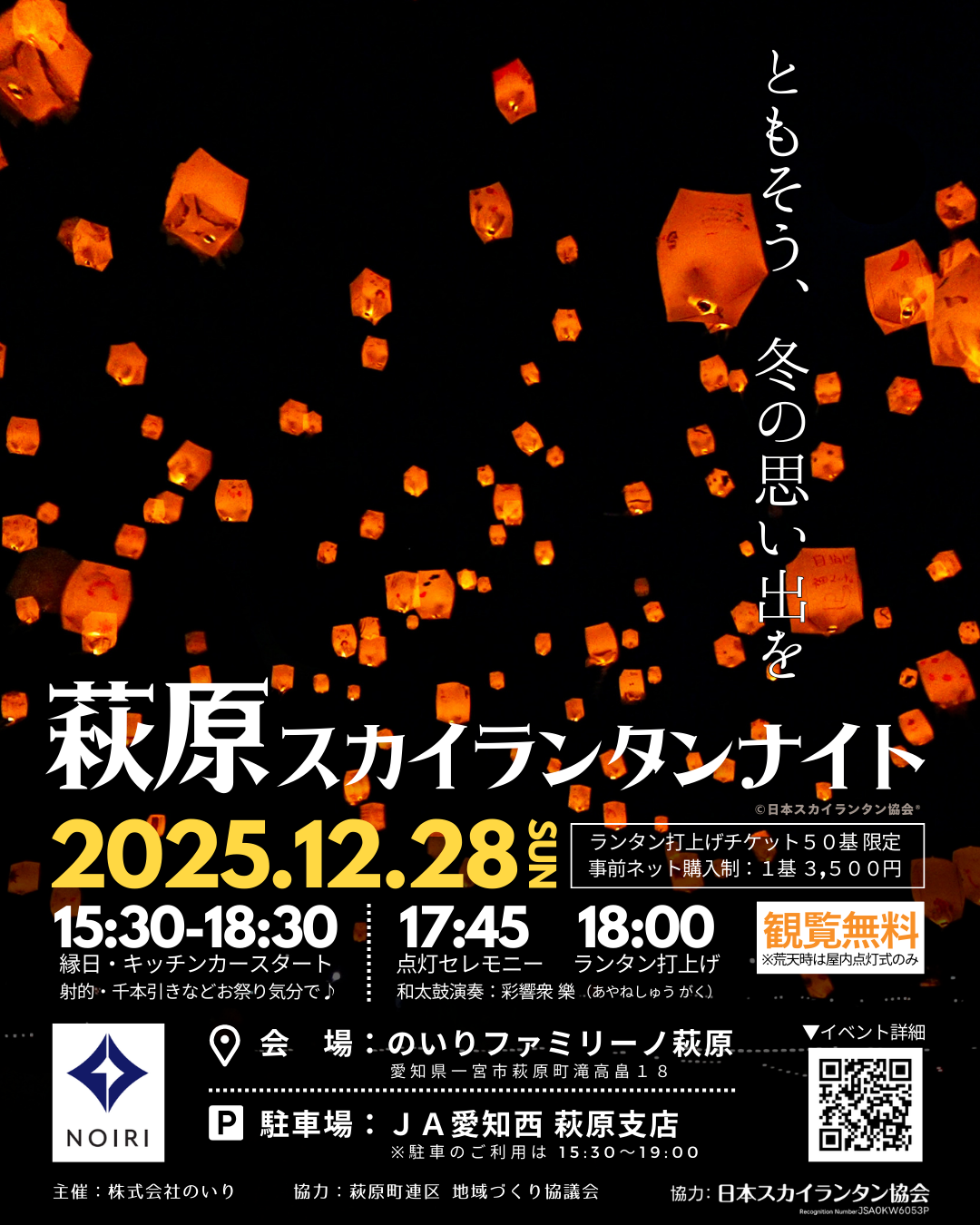 | 概要 | 冬の夜空にランタンの灯りが広がる、一宮市萩原町 初のスカイランタンイベントです。 |