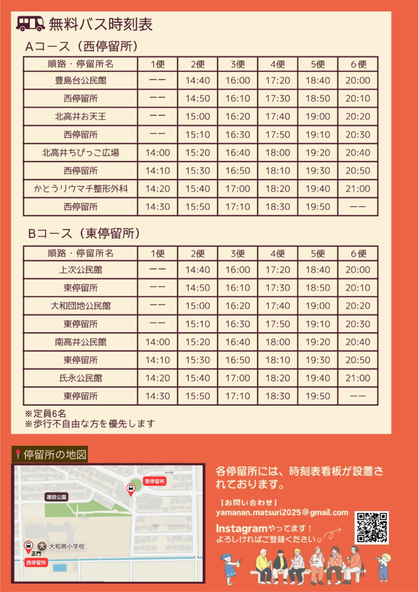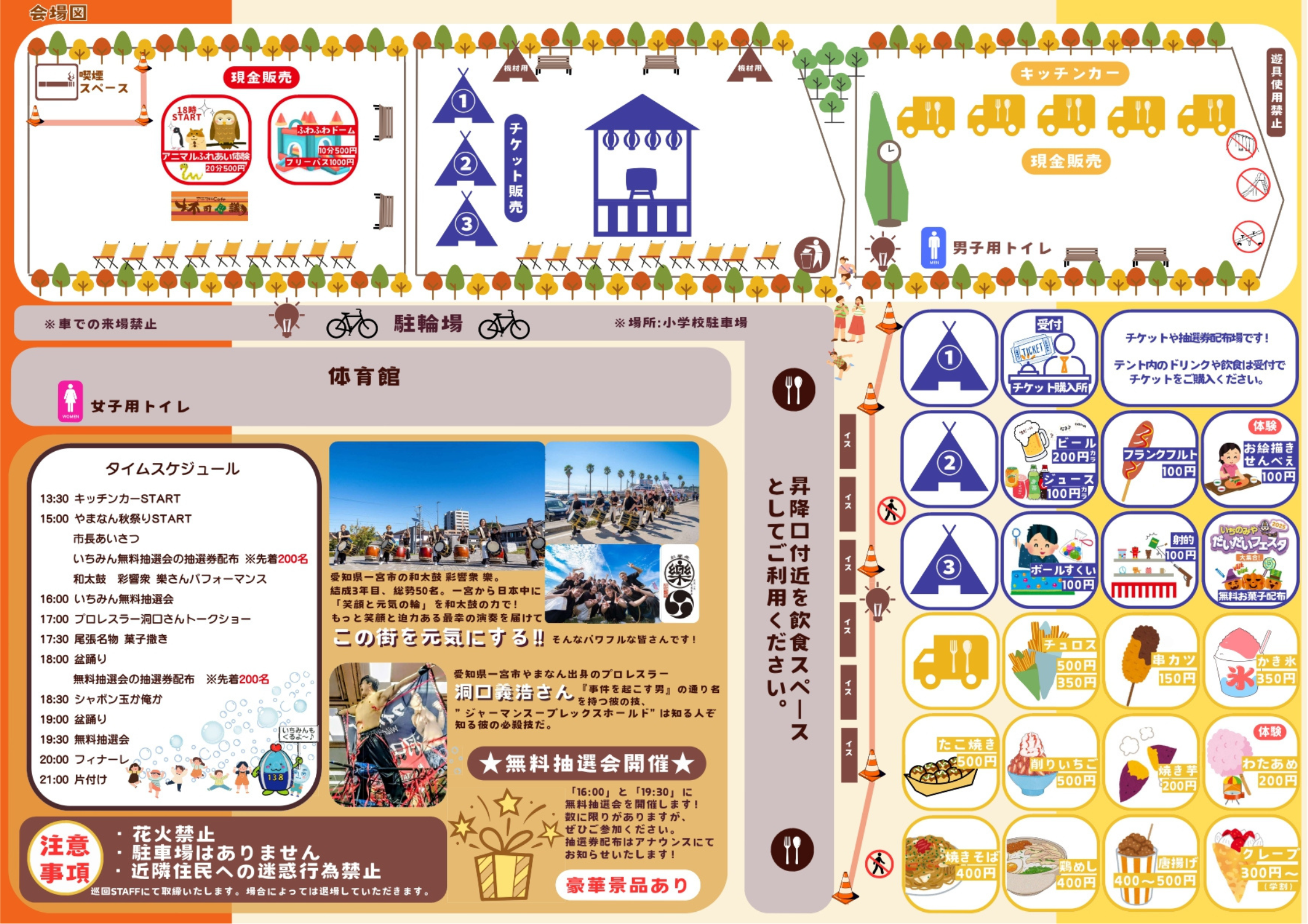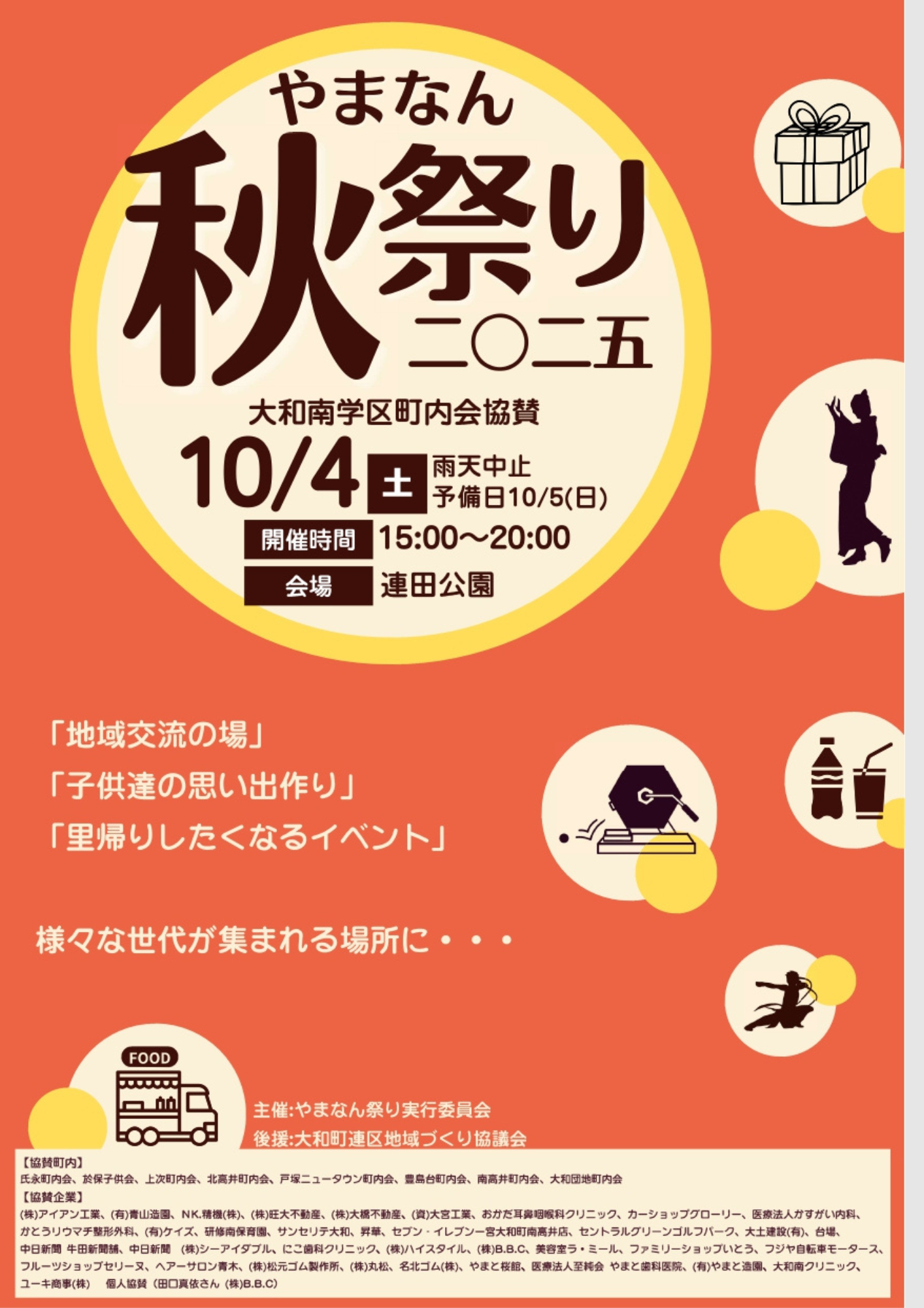 10月042025 イベント 10月4日「やまなん秋祭り」連田公園(一宮市立大和南小学校 隣) 今年の秋、一宮市に“みんなで楽しめるお祭り”が帰ってきます! 途絶えていた夏祭りを復活させたい――。 そんな想いから、大和南小学校近隣の団体が立ち上がり、地域の町内会が協力して新しいお祭りを企画しました。テーマは「地域交流の場」「子どもたちの思い出作り」「里帰りしたくなるイベント」。世代を超えて笑顔があふれる、温かい時間を地域みんなで育んでいきます。 オープニングは「彩響衆 樂」の和太鼓! 当日の注目は、MEDIA138アンバサダー「彩響衆 樂」の和太鼓パフォーマンス!15:00のオープニング演奏に加え、18:00からの盆踊りも盛り上げます。夏に盆踊りへ行けなかった方も、この秋は太鼓のリズムにあわせて一緒に踊りませんか? さらに、オープニングにさきがけて、13:30からキッチンカーがスタートし、おいしいグルメがずらり。無料抽選会(先着200名)、プロレスラー洞口さんのトークショーやお菓子まき、アニマルふれあい体験、ふわふわドーム、射的やボールすくいなど、子どもから大人まで楽しめる企画が盛りだくさん! 「いちのみやだいだいフェスタ2025」パンフレットを持って、やまなん秋祭りへGO! やまなん秋祭りは「いちのみやだいだいフェスタ」の一環として、無料お菓子配布も予定されています。 パンフレットを開くと、やまなん秋祭りの情報も掲載されています。そしてなんと…当日この冊子を持ってきた 小学生以下のお友だちには“お菓子をプレゼント”! 秋のお祭りを楽しみながら、おいしいお菓子もゲットして、家族みんなで笑顔いっぱいの思い出をつくりましょう! 「やまなん秋祭り」 概要 イベント名称やまなん秋祭り コンセプト2019年以降、開催が途絶えていた夏祭りを復活させたい――。 そんな想いから、大和南小学校近隣の団体が立ち上がり、地域の町内会が力を合わせて新しいお祭りを企画しました。 これまでの感謝と恩返しの気持ちを込めて、誰もが楽しめる場をつくることを目指しています。 コンセプトは、地域のつながりを深める「交流の場」、子どもたちが笑顔で楽しむ「思い出作り」、ふるさとに帰りたくなる「里帰りイベント」 世代を超えて笑顔があふれる、地域ならではの温かいお祭りを、みんなで一緒に育んでいきます。 開催頻度不定期 開催 開催日2025年10月4日(土) 雨天中止 ※予備日:10月5日(日) 開催時間15:00~20:00 ※キッチンカーは13:30開始 開催場所連田公園(一宮市立大和南小学校 隣) 住所愛知県一宮市大和町戸塚連田1−2 駐車場なし ※公共交通機関をご利用ください 最寄りの交通機関名鉄「島氏永駅」より徒歩15分 ホームページ/SNSinstagramcontact お問い合わせやまなん祭り実行委員会 yamanan.matsuri2025@gmail.com 周辺MAP この投稿をInstagramで見る やまなん祭り実行委員会(@yamanan_matsuri)がシェアした投稿 この投稿をInstagramで見る やまなん祭り実行委員会(@yamanan_matsuri)がシェアした投稿 この投稿をInstagramで見る やまなん祭り実行委員会(@yamanan_matsuri)がシェアした投稿